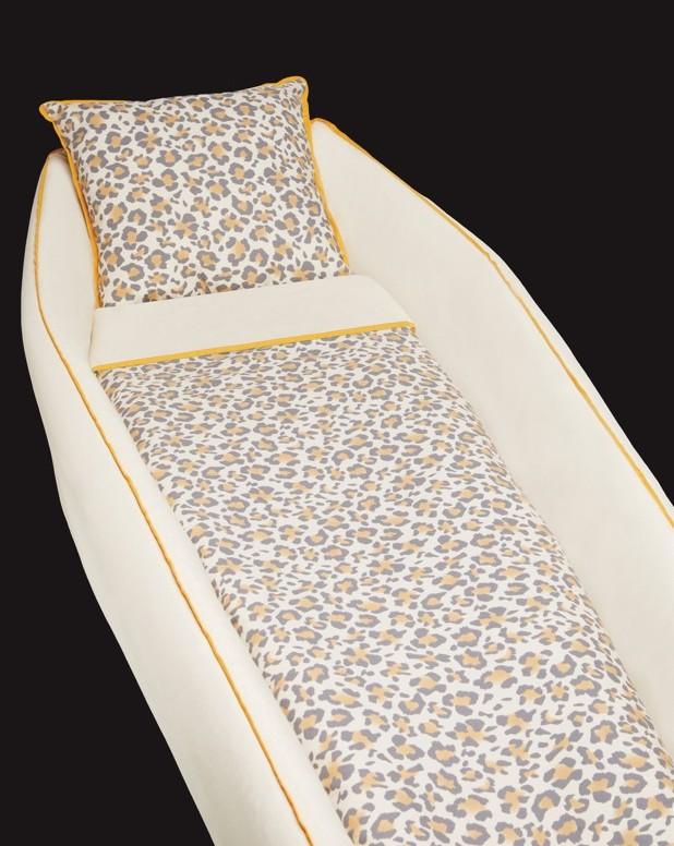 Motifs léopard sur fond couleur beige Couverture et oreiller réversibles : Motifs ou uni couleur beige Finitions coutures avec biais uni jaune moutarde 100% Fabriqué en France